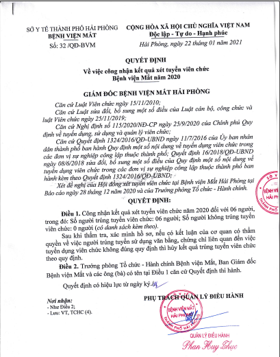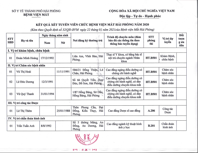 Bệnh viện Mắt Hải Phòng thông báo đến các thí sinh về việc kết quả xét tuyển viên chức tại Bệnh viện Mắt Hải Phòng năm 2020 như sau: