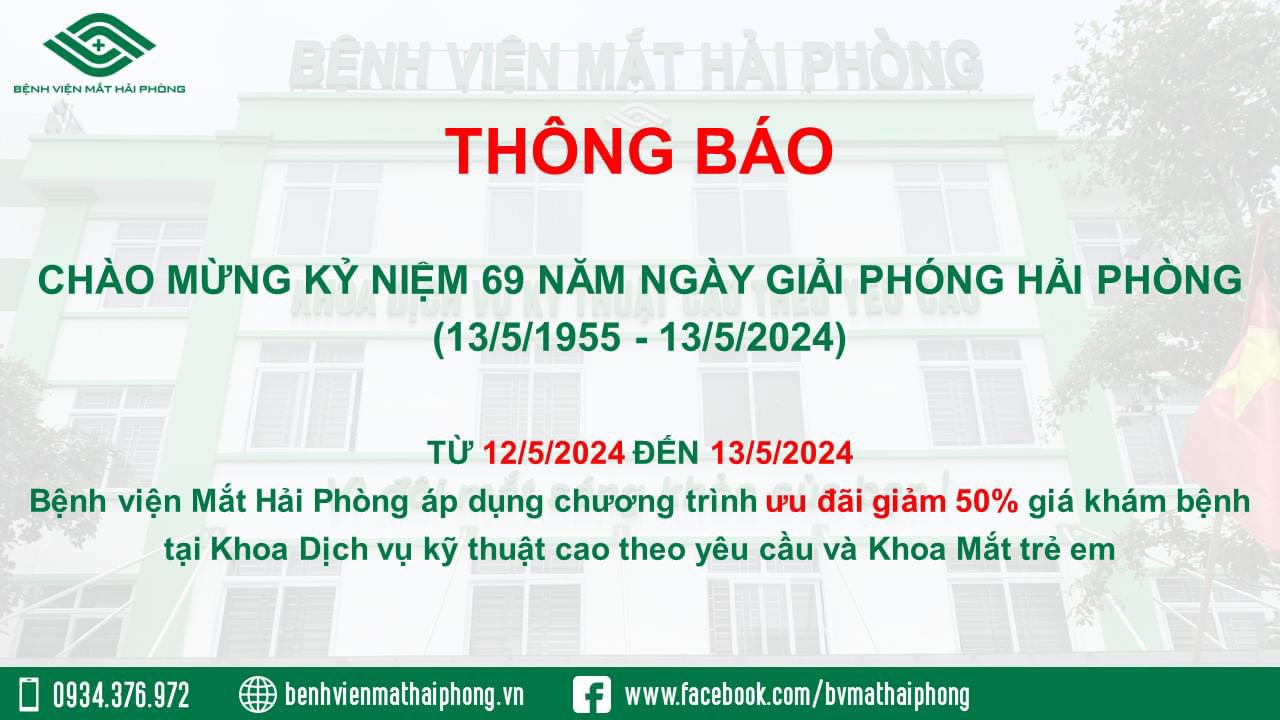 Chào mừng Kỷ niệm 69 năm Ngày giải phóng Hải Phòng (13/5/1955 - 13/5/2024), Bệnh viện Mắt Hải Phòng gửi tới Quý khách hàng và toàn thể nhân dân Hải Phòng lời chúc sức khỏe, hạnh phúc và thành công!