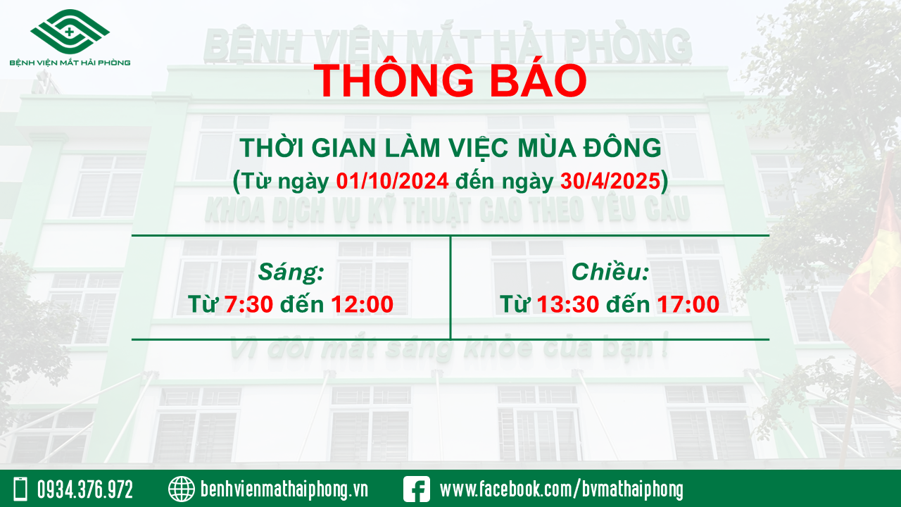 Bệnh viện Hải Phòng trân trọng thông báo đến người dân, quý khách hàng và đối tác về thời gian làm việc Mùa đông của Bệnh viện kể từ ngày 01/10/2024 đến hết ngày 30/4/2025 như sau: