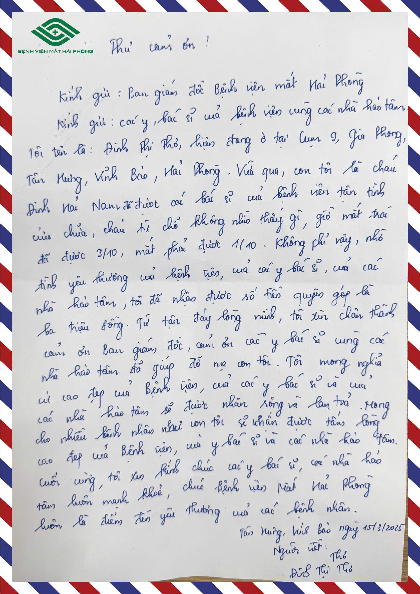 Việc hỗ trợ các bệnh nhân có hoàn cảnh khó khăn không chỉ là trách nhiệm mà còn là tình cảm, là nghĩa cử cao đẹp của đội ngũ y bác sĩ Bệnh viện Mắt Hải Phòng. Bệnh viện sẽ tích cực theo dõi, điều trị và đồng hành cùng em trong thời gian tới.