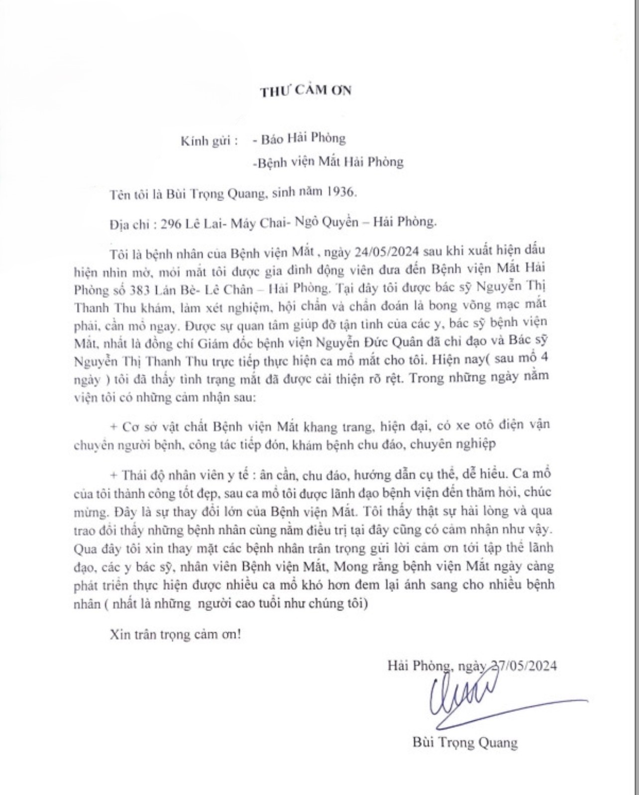 Thư cảm ơn gửi đến Bệnh viện Mắt Hải Phòng ngày 27/05/2024